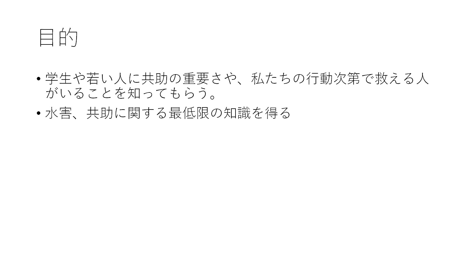 学生や若い人に共助の重要さや、助けるために行うべきこと(知っておく必要があること)を知ってもらう。